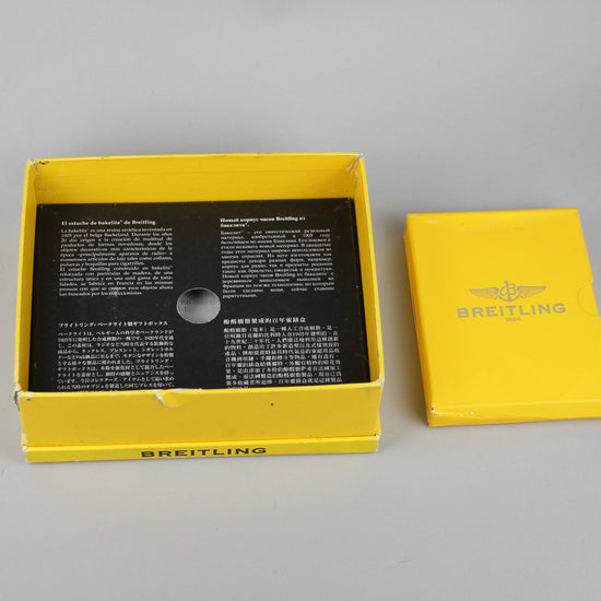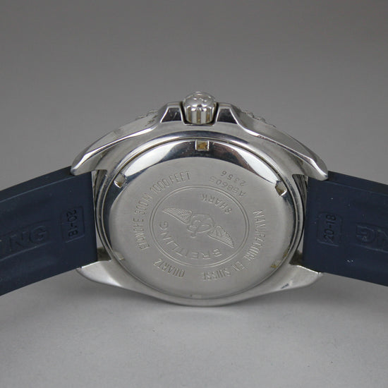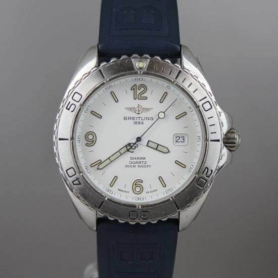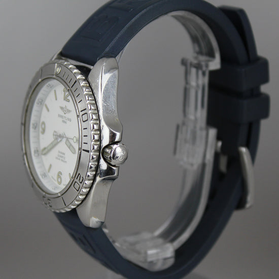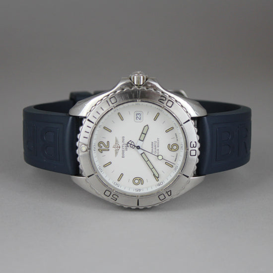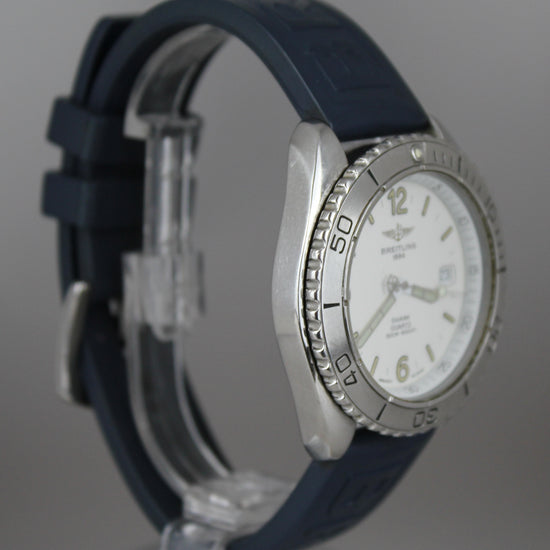 Breitling multipurpose battery watch with a rarer white dial. Watch has been pressure tested a while ago and comes with a half Breitling watch box with numerous papers related to the maintenance and repairs of the watch. Case has traces of age and use. Crown is screw-down. Rubber strap and buckle are Breitling. Watch and its features work flawlessly. |