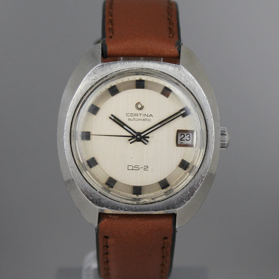 Certina DS-2 automatic watch with a slightly rarer two-tone dial. Crystal is in good condition, only one mark can be found around six o'clock, right on the edge of the crystal. Case has signs of age and use and there is an engraving on the caseback. Crown is original and the leather strap has been used. Service history is unknown, but the watch works well. Date changes and the watch is running approximately +- 30 seconds per day. |