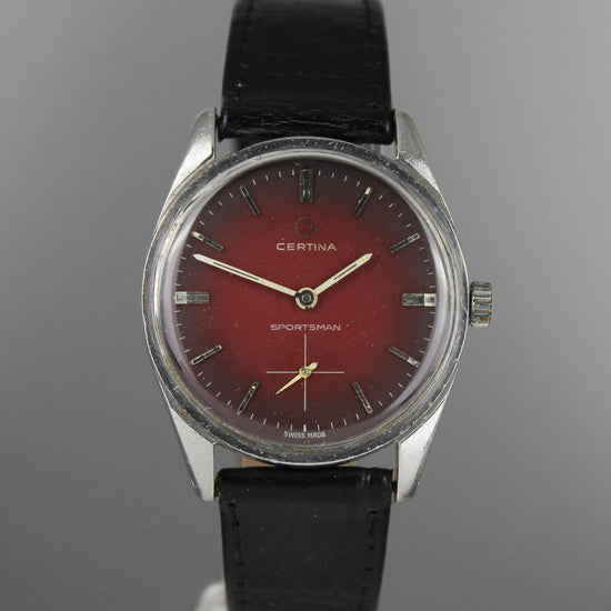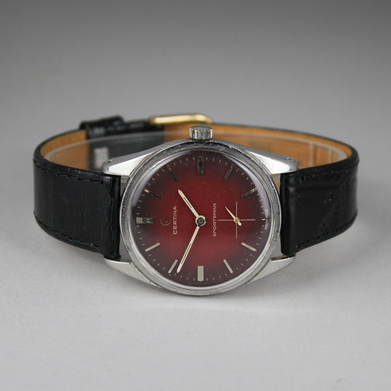 | A gorgeous red dial Certina manual wind watch. The case shows signs of age and use and the leather strap has been used. Service history is unknown, but the watch works and it is running approximately +- 30 seconds per day. |