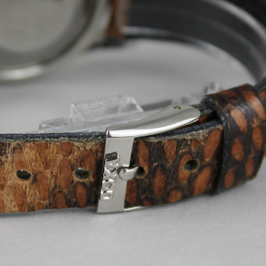 Rare Doxa automatic watch with a grey dial and original crown, strap and buckle. Crystal is in good condition, no major scratches or cracks. Dial has some patina. Case shows signs of age and use. Service history is unknown, but the watch works well and it is running approximately +- 20 seconds per day. |