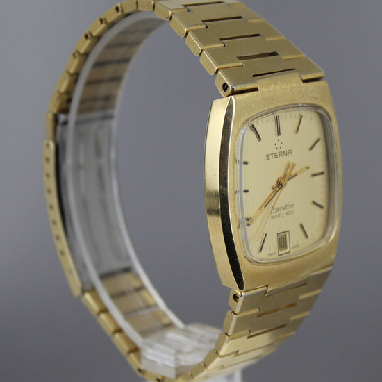 Eterna Executive quartz watch in excellent original condition. Case and original bracelet show signs of age and use, and there is an engraving on the caseback. Bracelet fits a wrist of approximately 20 cm thick. Crown is original. Service history is unknown, but the watch and its features work well. Comes with a fine Eterna watch box. |