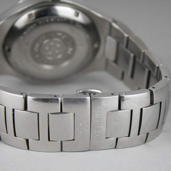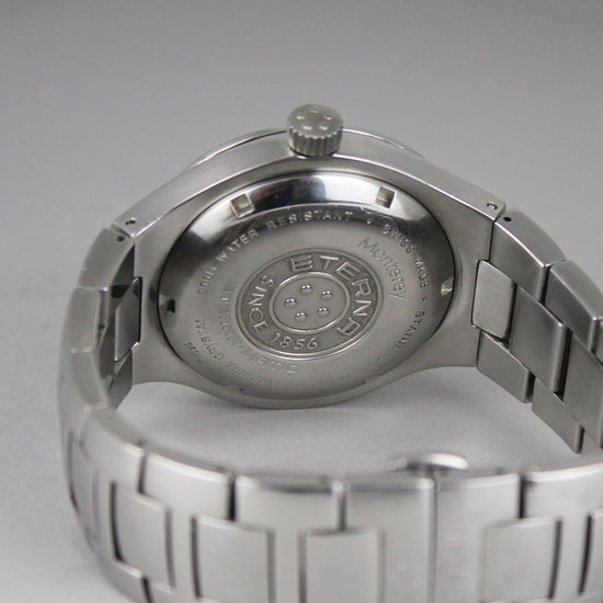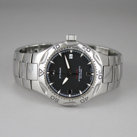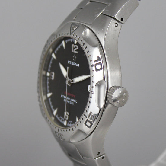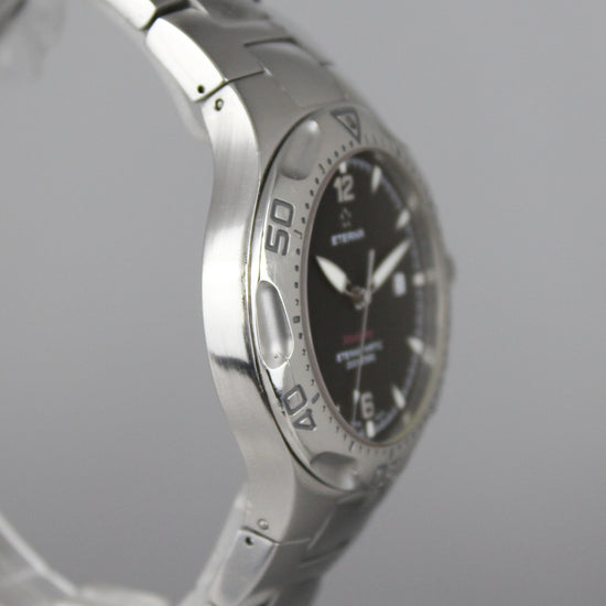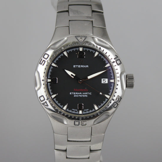 Eterna's sturdy Monterey diving watch, serviced 5/2025 by Kellohuolto Kangasniemi. There is one small mark on the crystal above the Monterey text. Case and steel bracelet have signs of age and use. Bracelet fits a wrist of approximately 18 cm and the crown is screw-down. Watch and its features work flawlessly. |