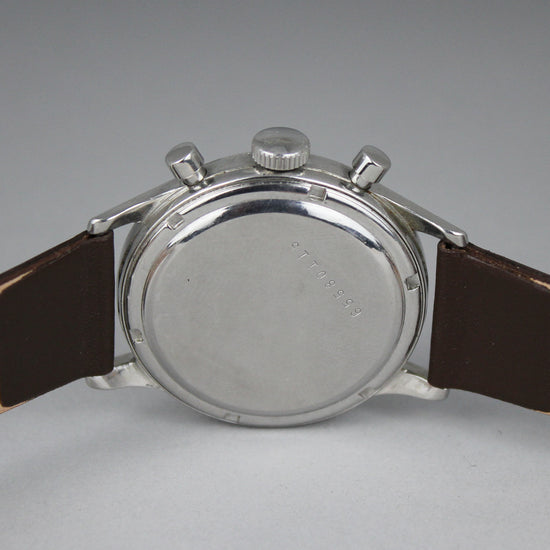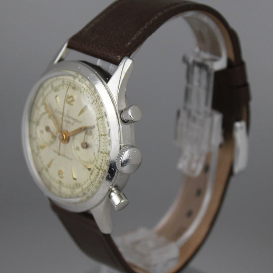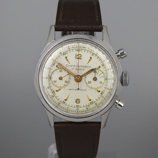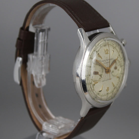 A rare jumbo-sized and steel-cased Girard Perregaux chronograph. The watch has been serviced in Turku by KultaViljaset and the service has a two-year warranty. Crystal is in good condition, no major scratches or cracks. Dial and hands have an even patina from age. Case has signs of age and use, and the leather strap has been worn a few times. Watch and its features work flawlessly. |