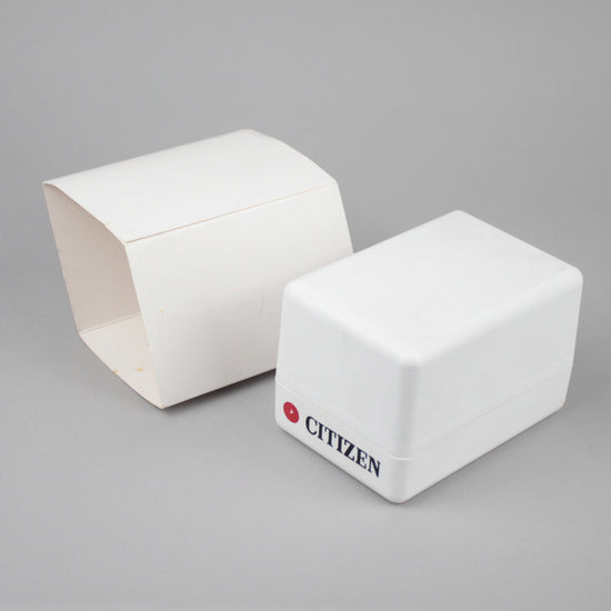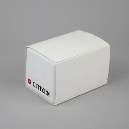 Citizen's small plastic watch box with outer cardboard. There are several similar boxes and there may be slight differences between them in terms of color brightness and tone, as well as condition. |
