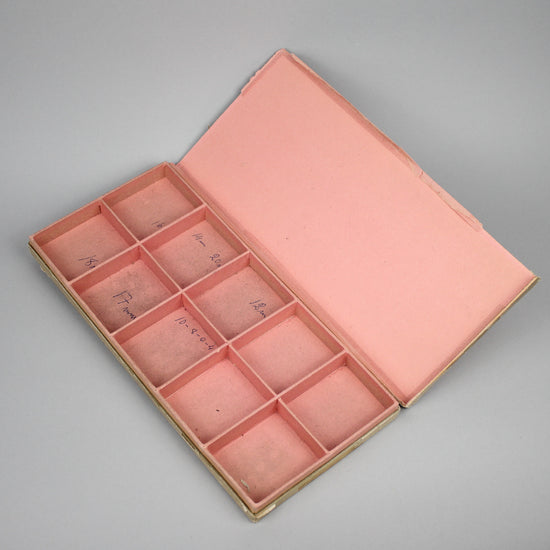 Zenith's large cardboard spare parts box. There is writing on the cover and inside and a piece has come off the cover. |