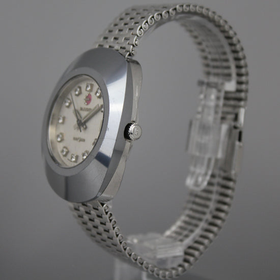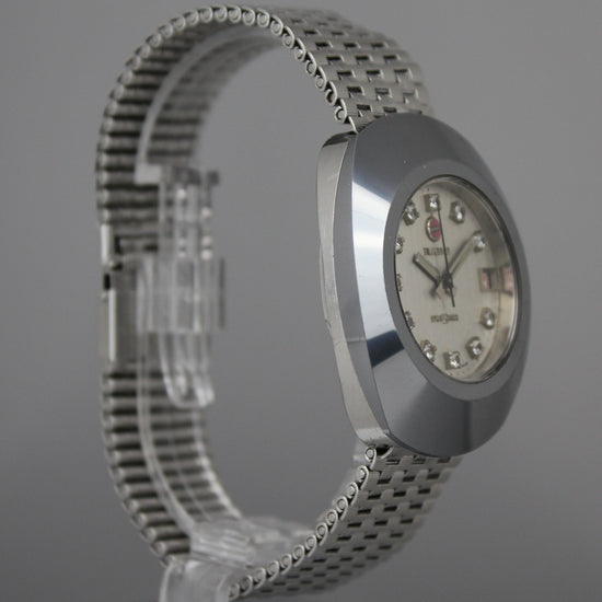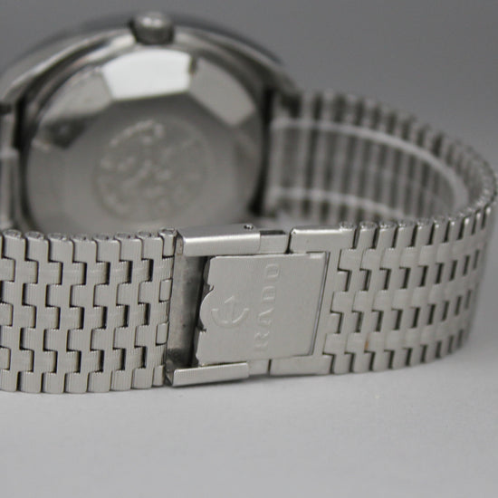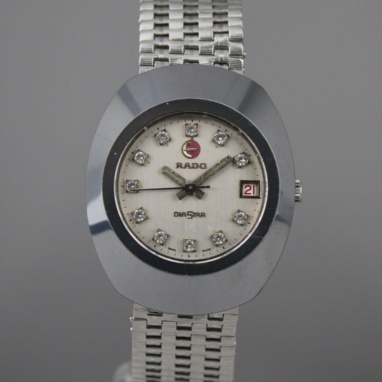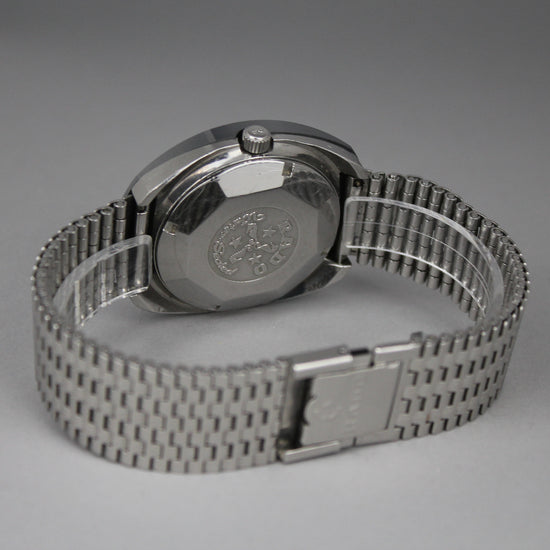 A really impressive Rado automatic watch, the face of which comes to life in nature. The crystal has a few light scratches. The dial has some patina, but its overall appearance is clean. The case has traces of age and use. The crown is not original. The original steel bracelet fits around a 19cm thick wrist. Service history is unknown, but the watch works. Date quick set works and the watch is running approximately +- 30 seconds per day. |