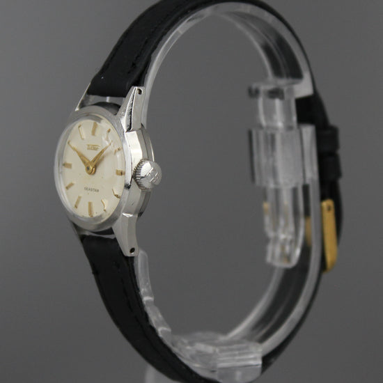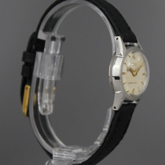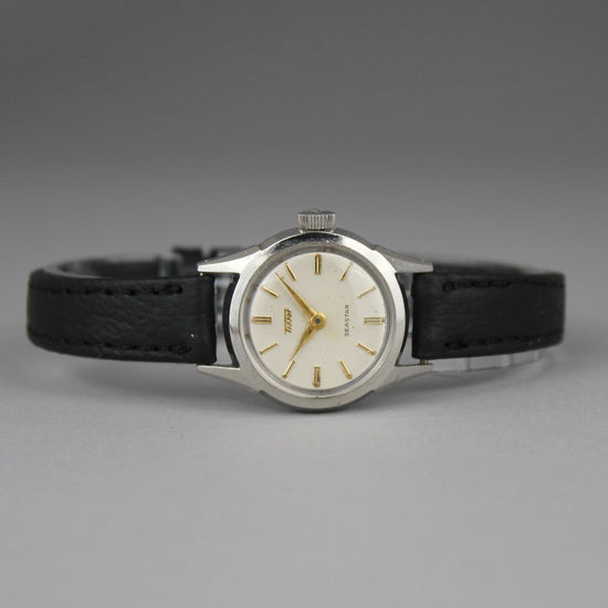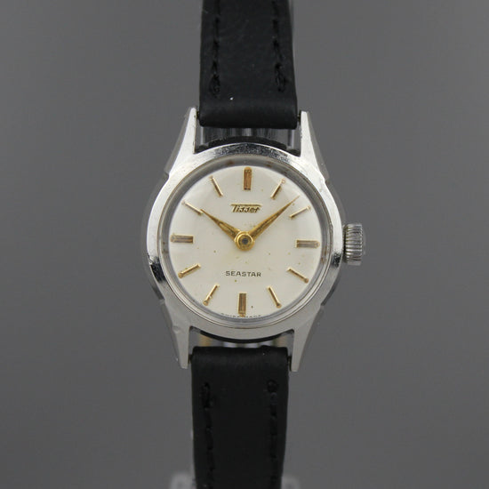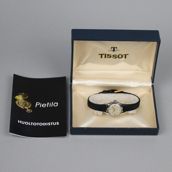 Tissot women's manual winding watch in great condition, serviced 1/2022 in Pietilä. Comes with a Tissot watch box, which completes the package. The crystal is in good condition, no big scratches or cracks. The dial has a nice looking patina. The case has traces of age and use. The crown is original and the leather strap is unused. The watch works perfectly. |