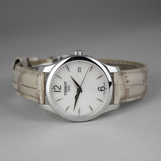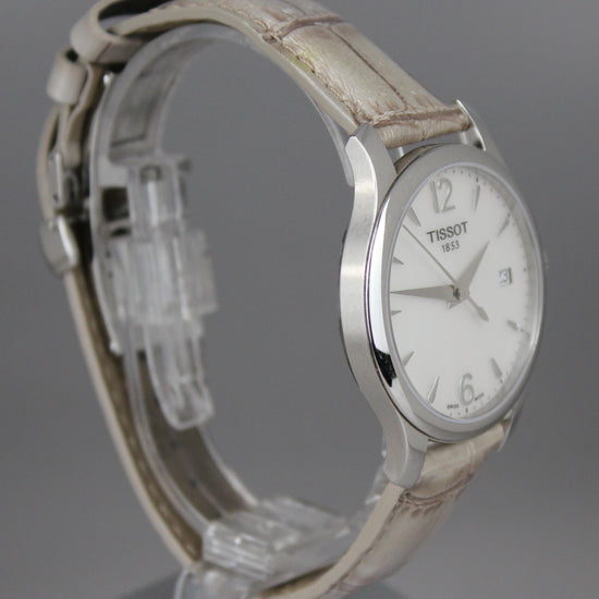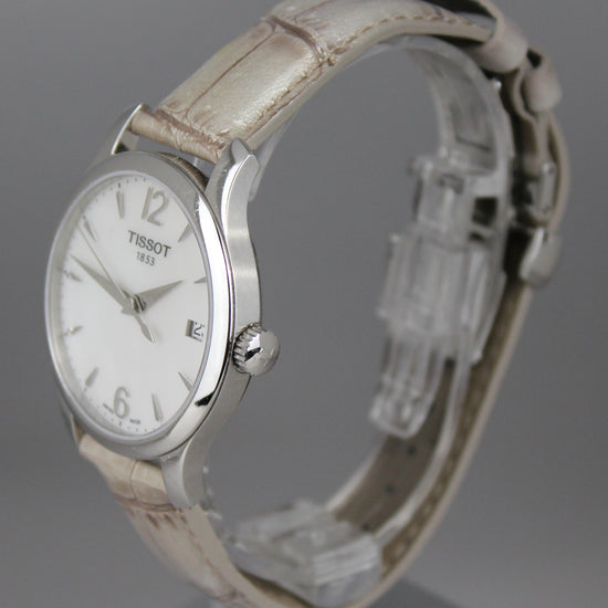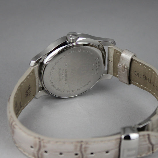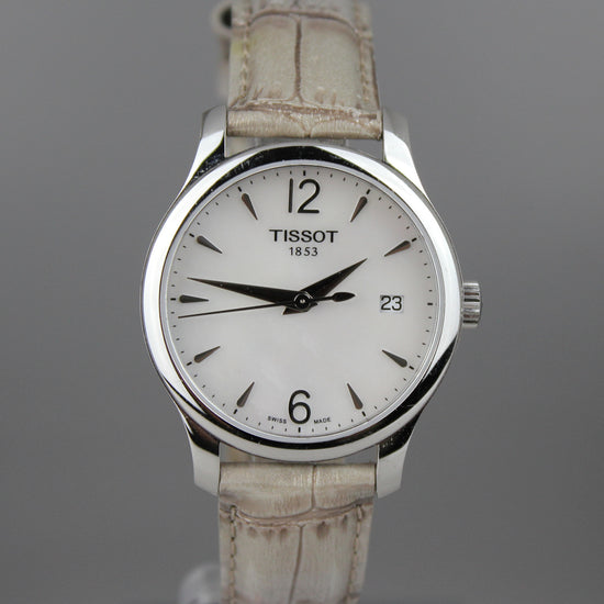 Tissot's stylish women's battery watch with a stunning mother of pearl dial that plays beautifully with the light. Case has signs of age and use. Leather strap and buckle are original. Watch and its features work flawlessly. |