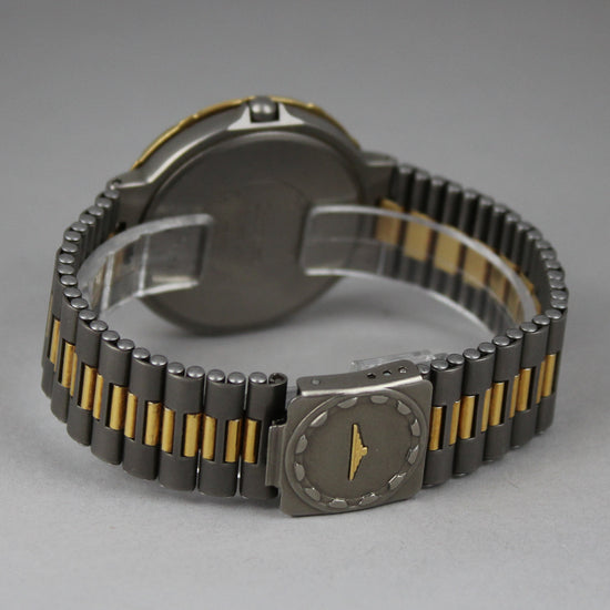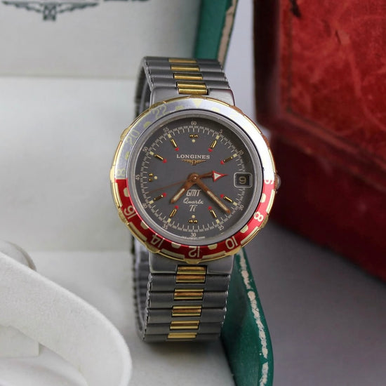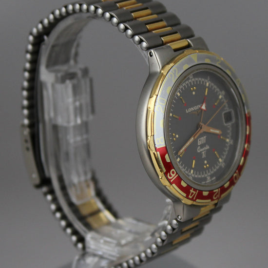 Rare Longines quartz watch with titanium case, bracelet and GMT function. Crystal and dial are in good condition. Case and original bracelet show signs of age and use. Bracelet fits a wrist approximately 17 cm thick. Service history is unknown, but the watch's features work as they should. Comes with a Longines watch box, which has a lot of wear on the outside. |