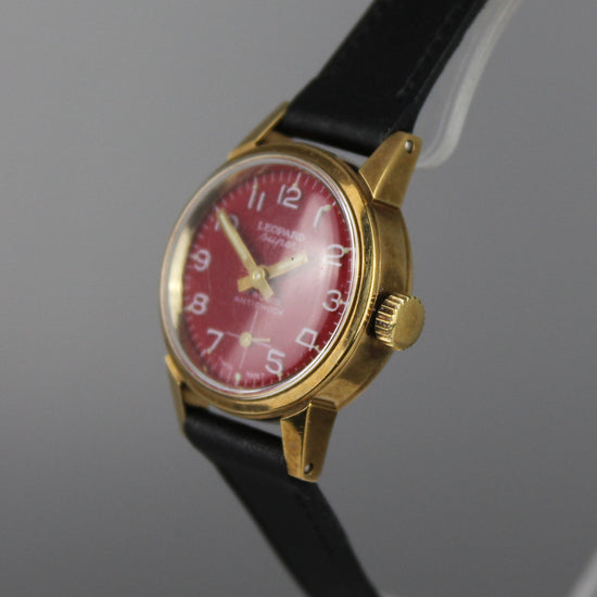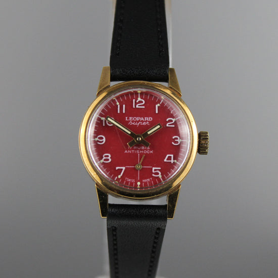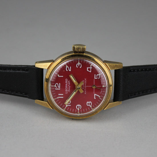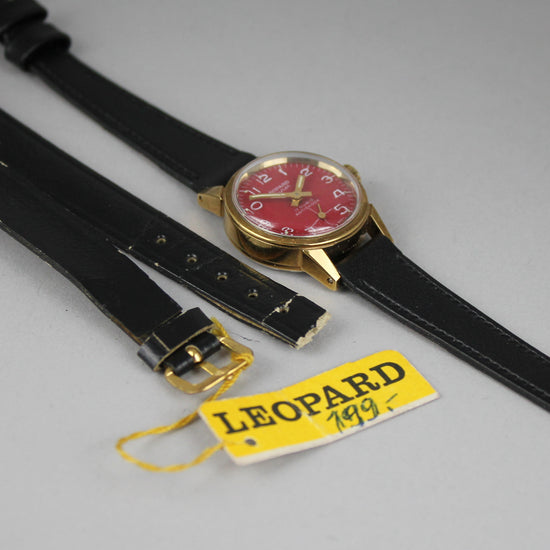Unworn women's Leopard Super manual wind watch with a nice red dial. Watch has minor signs of storage here and there from decades of storage. Leather strap attached to the watch is new and unworn and the old and hardened original strap and price tag are included. Service history is unknown, but the watch works. |