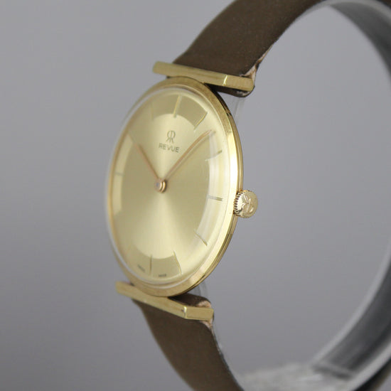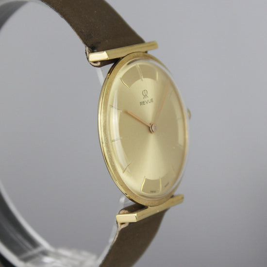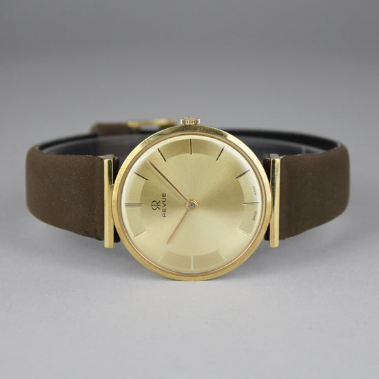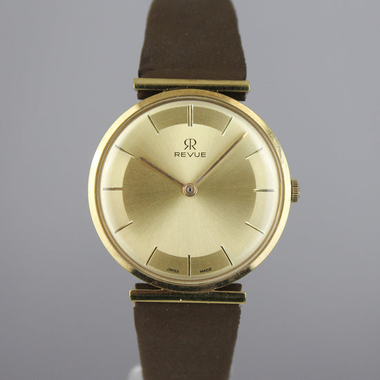Unworn Revue manual wind watch from a watch shop's old storage, which was serviced in 7/2025 at Kellohuolto Kangasniemi. Watch has minor signs of storage over the decades. Crown, strap and buckle are original. Watch and its features work flawlessly. |