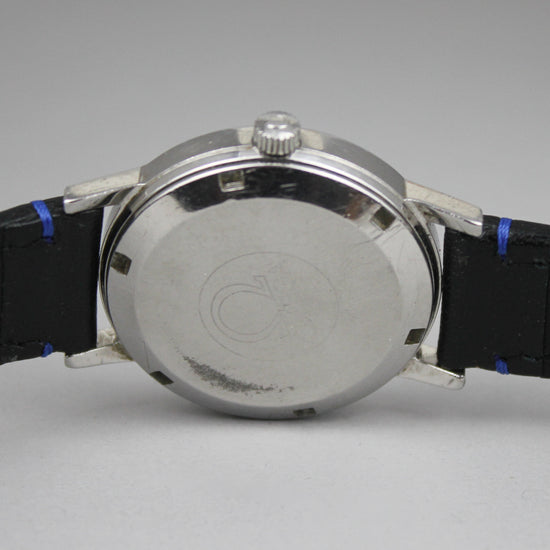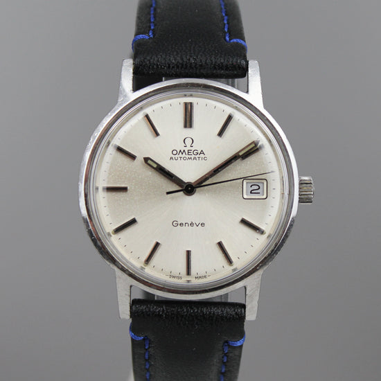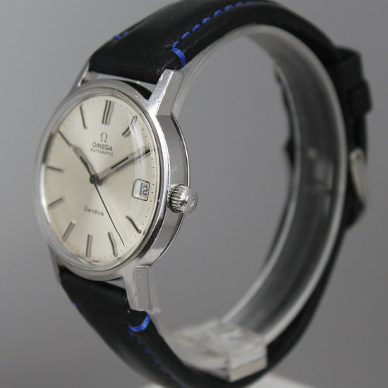 Omega Geneve automatic watch in good condition for its age with a light dial and steel case. Dial has a very light spot-like patina. Case has signs of age and use and the crown is original. Leather strap has been used. Service history is unknown, but the watch works. Date quick set works and the watch is running approximately +- 20 seconds per day. |