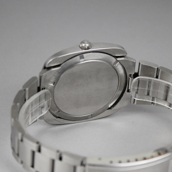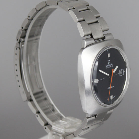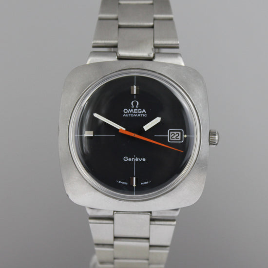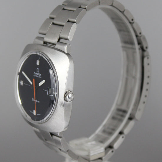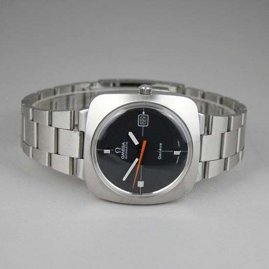 Sporty black dial Omega Geneve automatic watch with an integrated steel bracelet. Case and original bracelet show signs of age and use. The bracelet fits a wrist up to approximately 21 cm thick. Crown and crystal are original. Service history is unknown, but the watch works great. The quick set date function works by repeatedly pulling the crown outwards, and the watch's accuracy is approximately +- 10 seconds per day. |