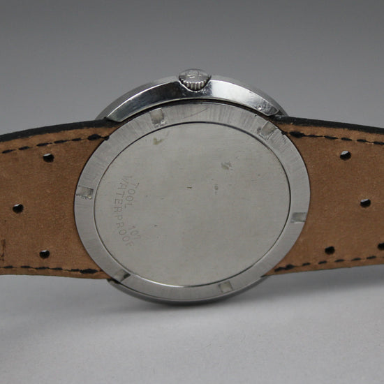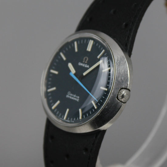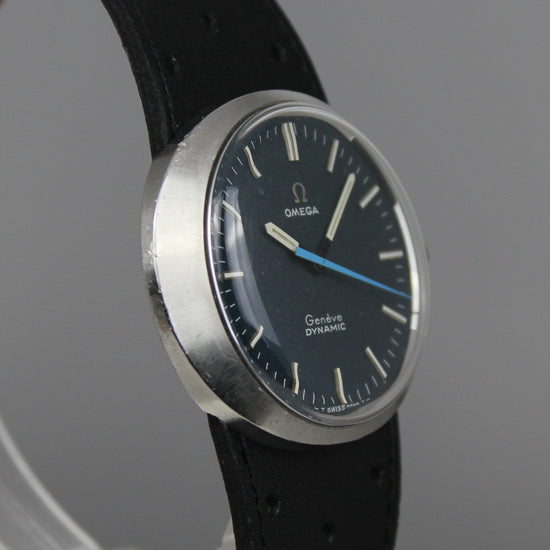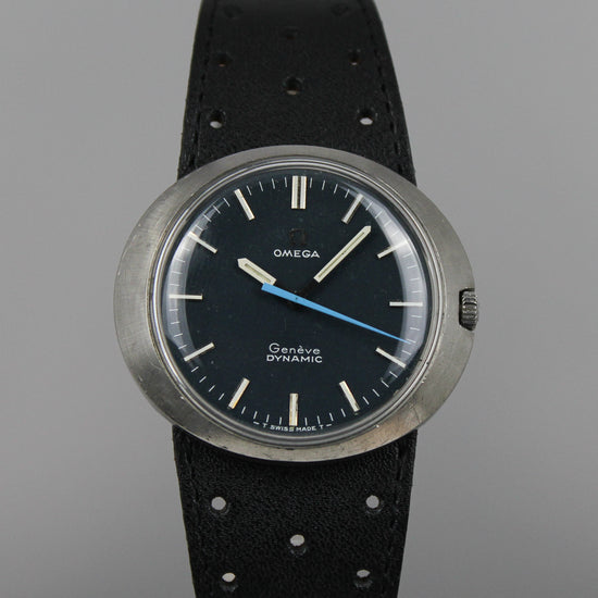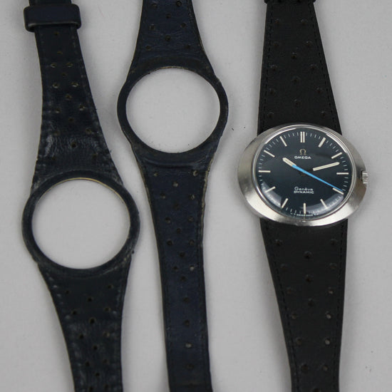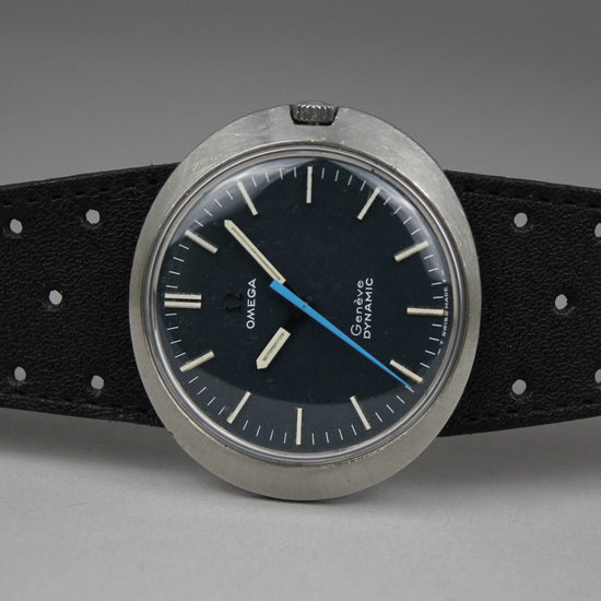 Iconic Omega Dynamic with a dark blue dial. Crystal is in good condition, no major scratches or cracks. Dial has a slight patina. Case has signs of age and use and the crown is original. Watch is now fitted with a Diplomat leather strap with an original steel buckle. It comes with two well-used original Omega leather straps without buckles. Service history is unknown, but the watch works and it is running approximately +- 40 seconds per day. |