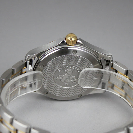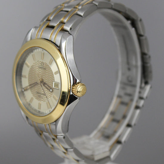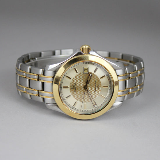 | A wave-dialed Omega quartz watch that is great for many different uses. Watch has signs of wear here and there, especially on the bezel. Bezel is 18k gold and the watch otherwise combines a nice combination of steel and gold details. Crown is screw-down. Seamaster collection bracelet is really sturdy and comfortable on the wrist thanks to its hidden buckle. Bracelet fits a wrist of about 20 cm thick. Watch and its features work great. |