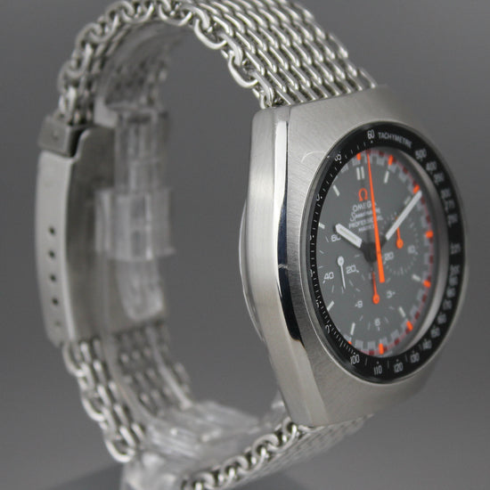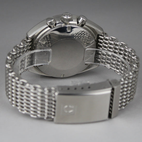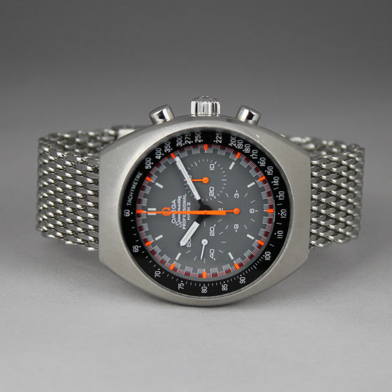 Iconic Speedmaster Mark II chronograph with a rare racing dial. Watch comes with Longitudi service papers from 2015. Watch may have been serviced since then, as the timegrapher data is still at a good level. Watch has also been pressure tested a while ago. Crystal and dial are in good condition. Case shows signs of age and use, but the bevels and brushings are easily visible. Omega 1380/237 steel bracelet is not original to this model, but it still fits the look of the watch nicely. Bracelet fits a wrist of approximately 18.5 cm thick. |