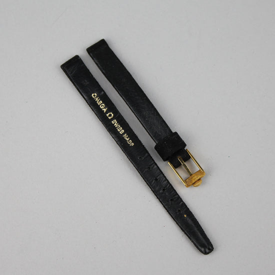 Unworn Omega leather strap with original buckle, suitable for women's watches due to its size. |