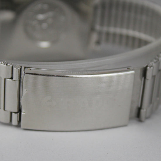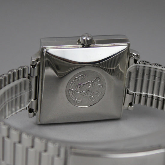 A rare square Rado automatic watch. Crystal is in good condition, no major scratches, but there is a small crack in the lower right corner. Dial is in good condition for its age. Case and original steel bracelet have signs of age and use. Bracelet fits a wrist of approximately 20 cm thick and the flexible buckle provides additional comfort. Crown is original. Service history is unknown, but the watch works fine. Date quick sets work and the watch is running approximately +- 5 seconds per day. |