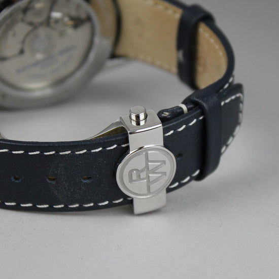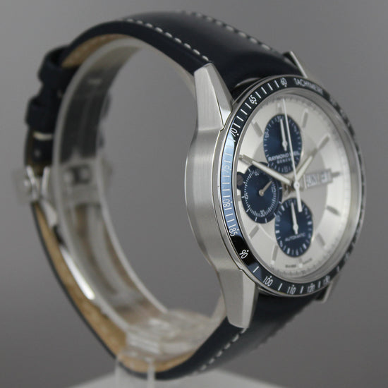 Raymond Weil's sporty chronograph with a nice blue and white color scheme. Comes with the watch's original box and papers. Watch has some signs of wear here and there, especially the buckle has made some scratches on the caseback. Pushers and crown are screw-down. Leather strap and buckle are comfortable to wear. Watch and its features work flawlessly. |