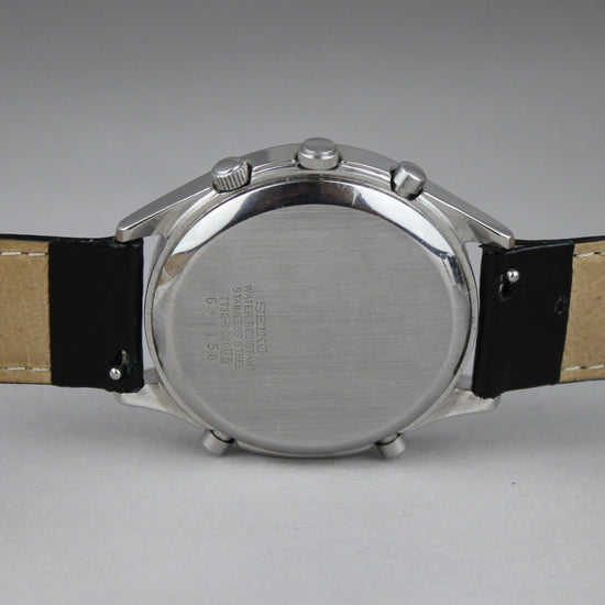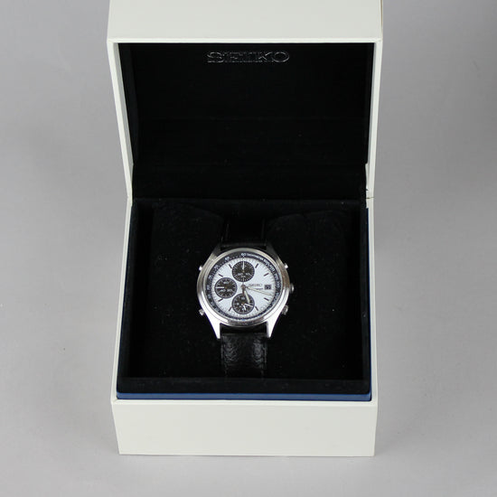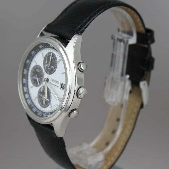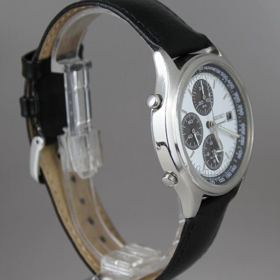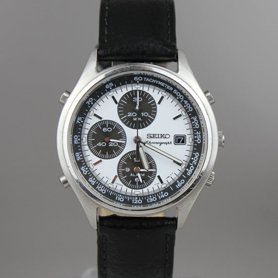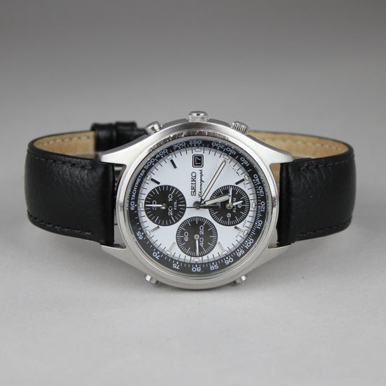 Rare "panda" Seiko chronograph. Watch was serviced at Kelloseppien Työhuone in 2020, a document of which comes with the watch. Seiko watch box is also included. Crystal and dial are in great condition. Case shows signs of age and use, and the leather strap is worn. Watch and its features work flawlessly. |