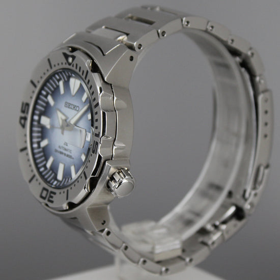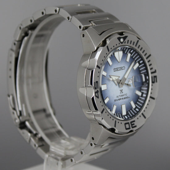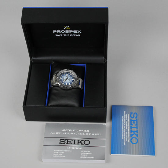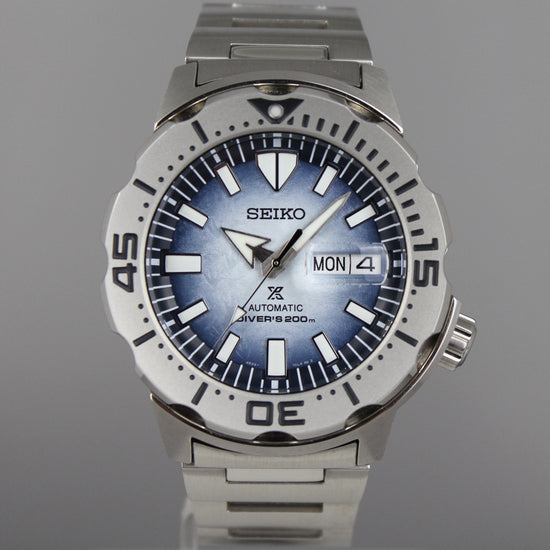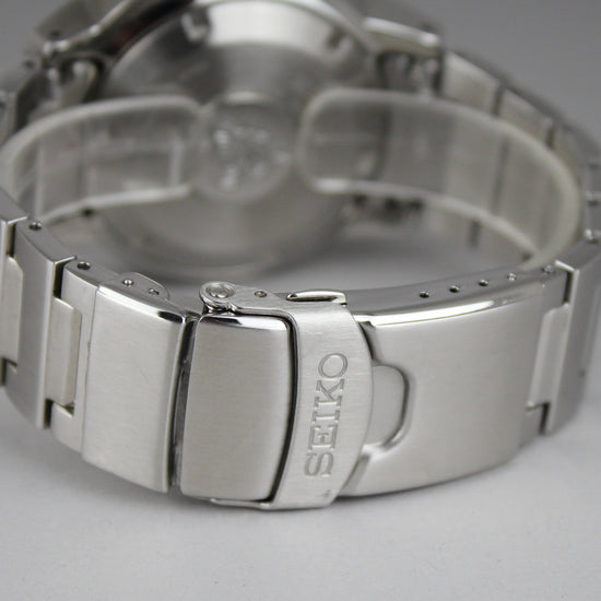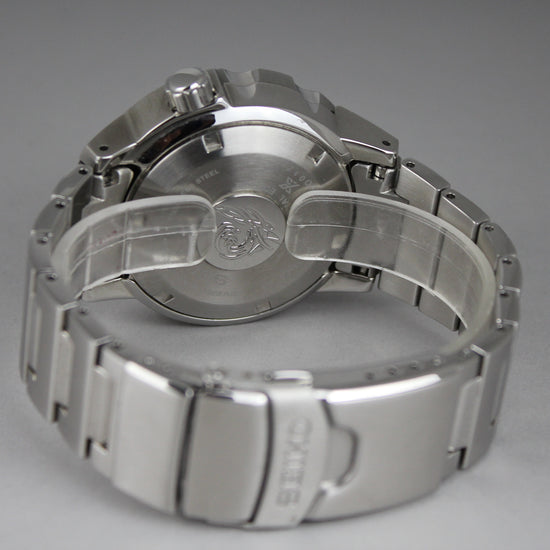 Seiko diver's watch with a stunning dial depicting an Antarctic ice with penguin tracks. Comes with the watch's original box, instruction booklet and warranty card. Watch has some signs of wear here and there. Steel bracelet feels really sturdy and the diving bezel moves smoothly. Bracelet fits to a wrist of about 20 cm thick and comes with two extra links that are missing their attachment pins. Watch and its features work flawlessly. |