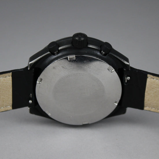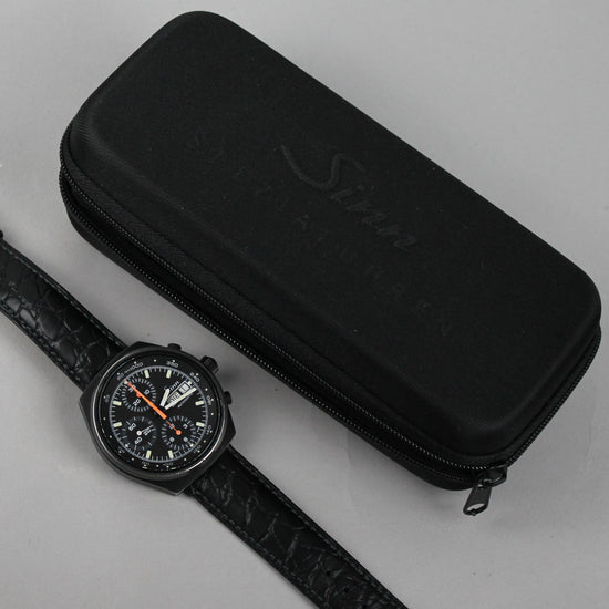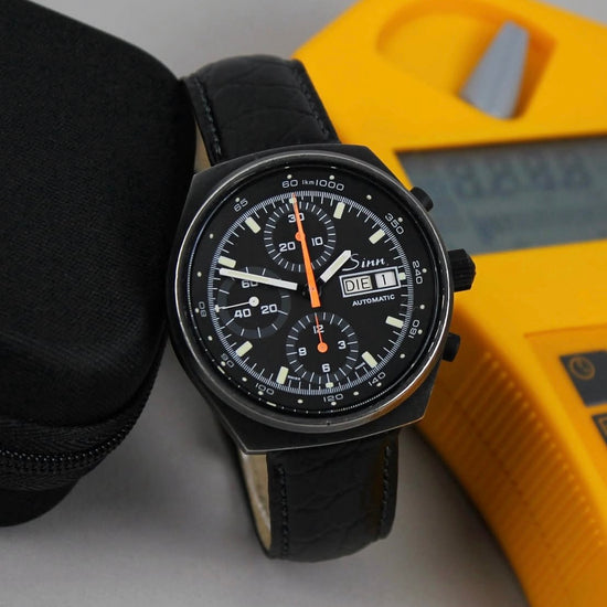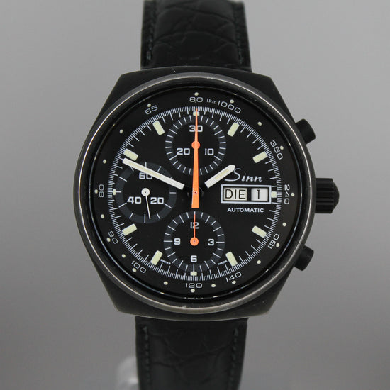 Rare Sinn 144 chronograph with black coated case. Watch was serviced in 3/2024 at the Sinn factory and comes with the replaced parts and a service case. Service warranty is valid until 3/2026. Crystal and dial are flawless. Case has signs of age and use and the crown is screw-down. Leather strap has only been worn a few times. |