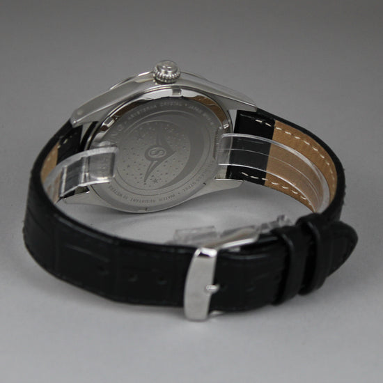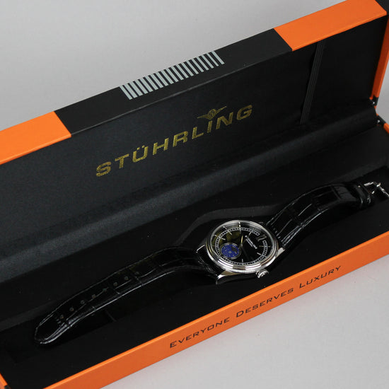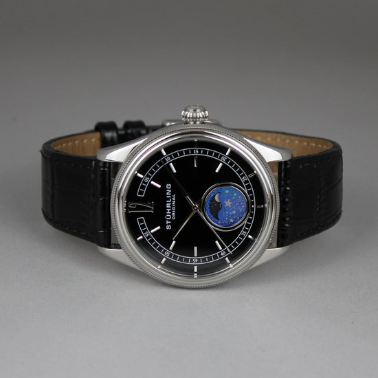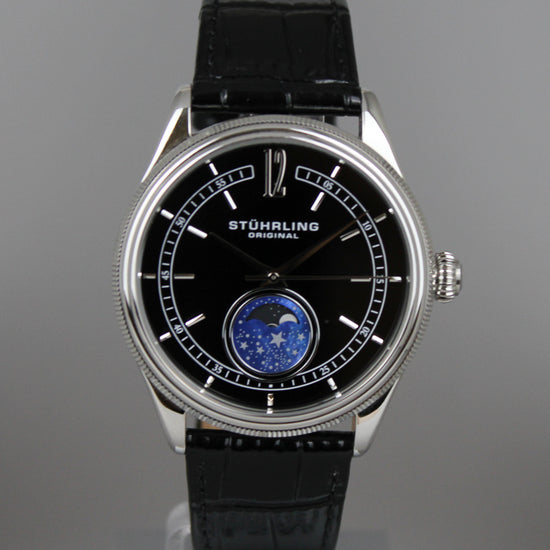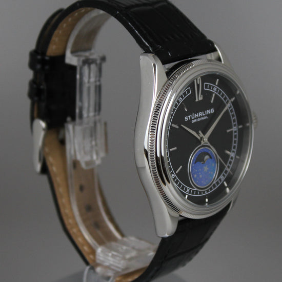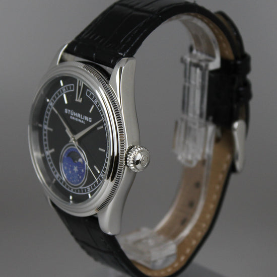 Stylish Stührling quartz watch with a nice moon phase feature. Crystal has a small dot-like mark around 4 o'clock. Watch has minor signs of wear here and there, but the overall appearance is neat. Leather strap and buckle are original to the watch and a Stührling watch box is also included. Watch and its features work flawlessly. |