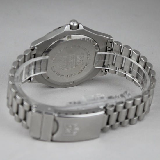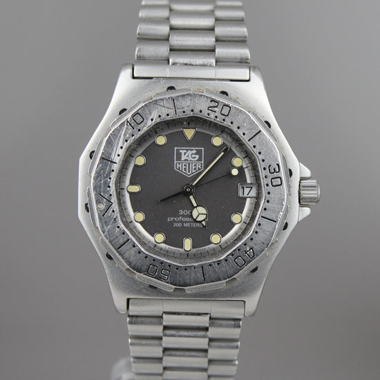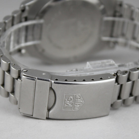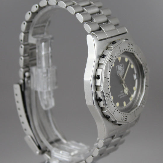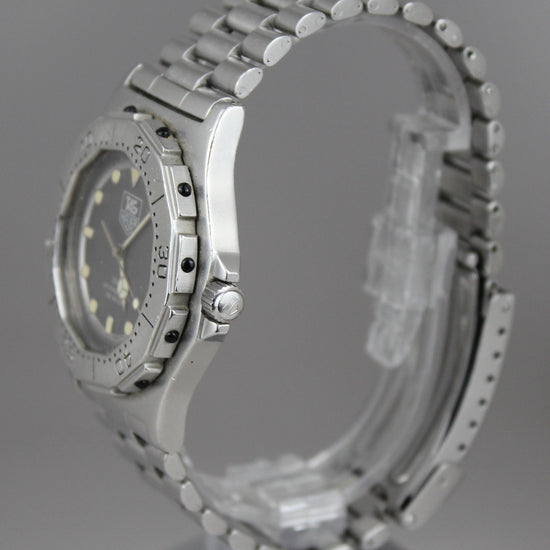 | Tag Heuer multi-purpose quartz watch with nicely patinated indexes and hands. Crystal and dial are in good condition. One black ball is missing from the edge of the diving bezel. Case and original steel bracelet have signs of age and use. Bracelet fits a wrist of approximately 19 cm thick and the diving extension adds a few more centimeters. Screw-down crown is original. Service history is unknown, but the watch and its features work well. |