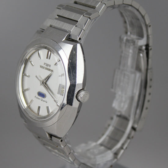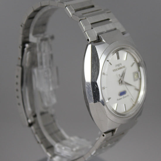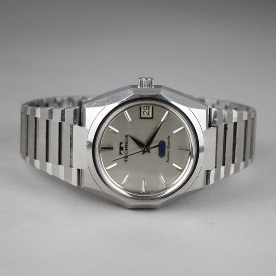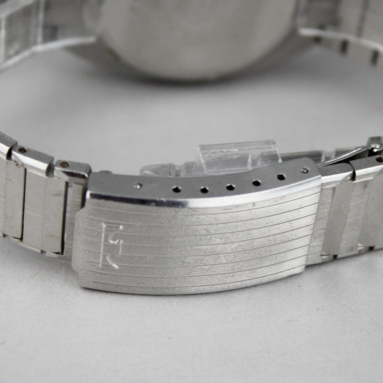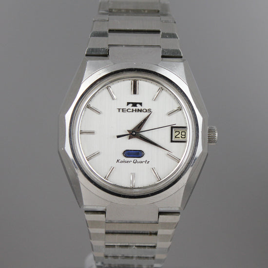 A sporty Technos Kaiser, which was one of the best Technos watches produced in its time. Crystal is in good condition and the dial is almost flawless. Case and original steel bracelet have signs of age and use. Bracelet fits a wrist approximately 19 cm thick. Crown is original. Service history is unknown, but the watch and its features work great. |
