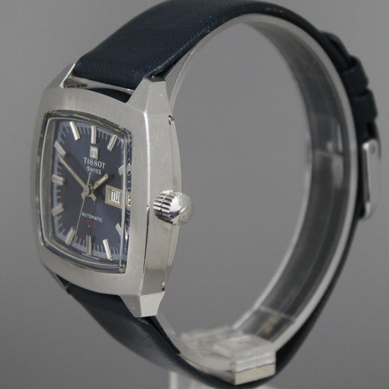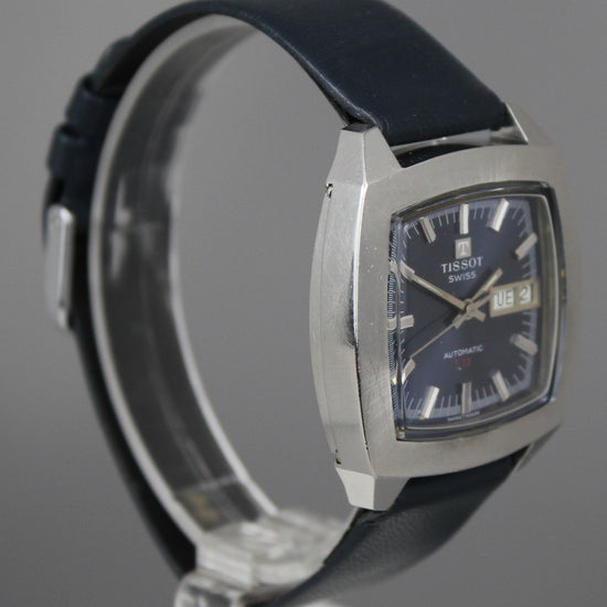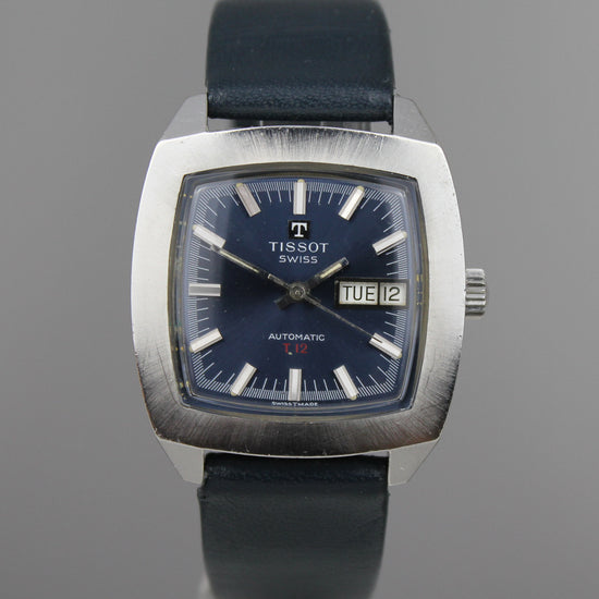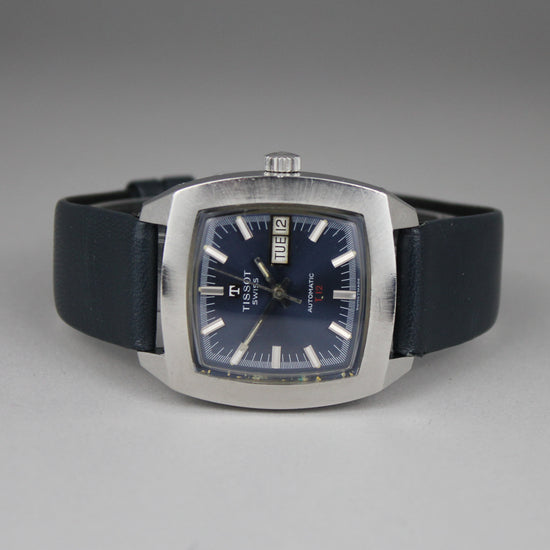 Tissot automatic watch with a stylish blue dial. Crystal has recently been replaced with a new original one. Dial is very clean for its age. Case has signs of age and use and the crown is original. Leather strap has been used. Service history is unknown, but the watch works well and it is running approximately +- 10 seconds per day. |