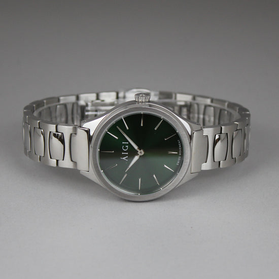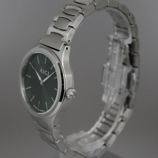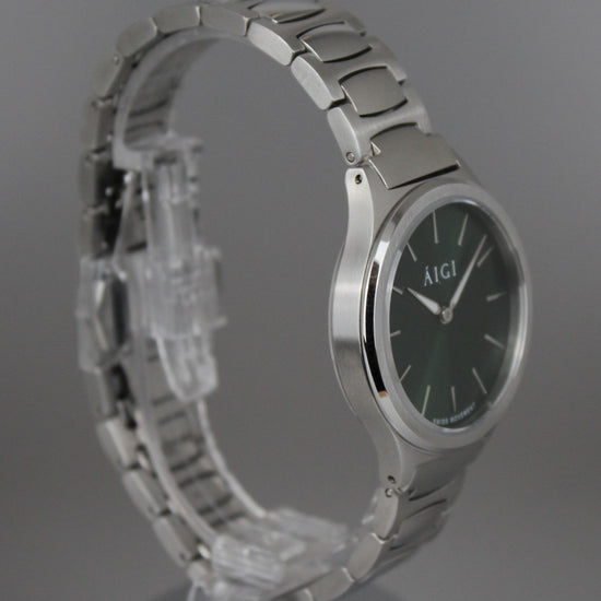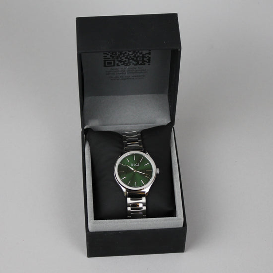 A stunningly beautiful women's quartz watch from a Norwegian micro brand with a deep green dial and a comfortable steel bracelet. Watch has hardly been used and the steel bracelet clasp still has the plastic in place. Watch comes with the original box. Watch and its features work flawlessly. |
