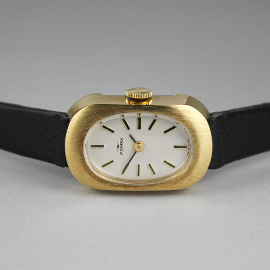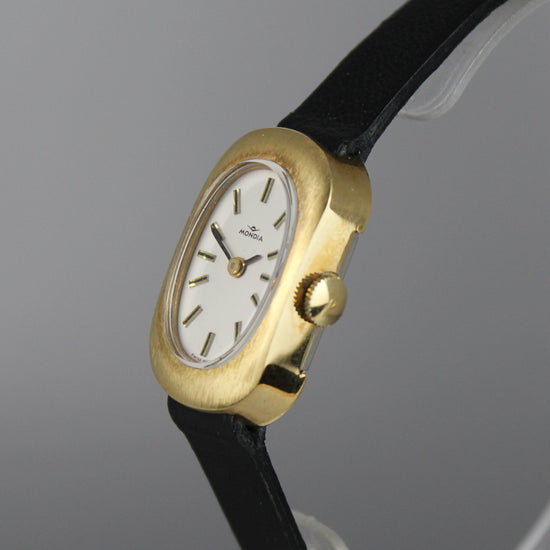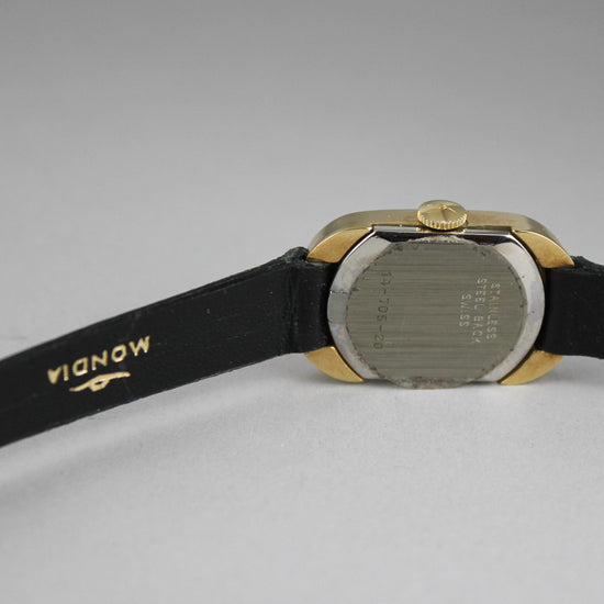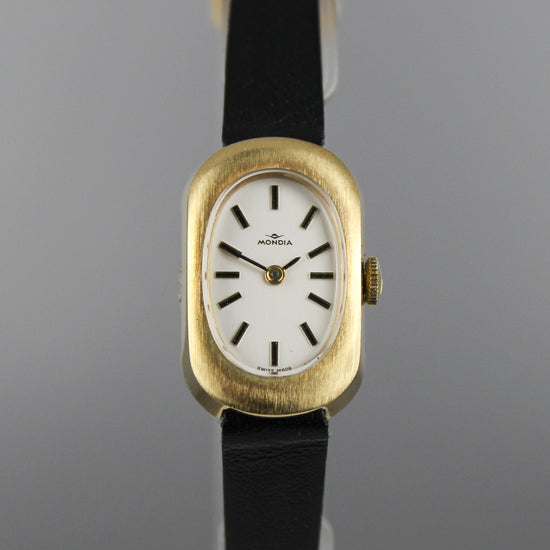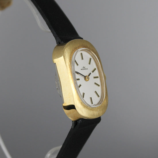 Unworn women's Mondia manual wind watch. Watch has minor signs from decades of storaging. Original hang tag is hanging from the leather strap and a sticker is still in place on the caseback. Service history is unknown, but the watch works. |