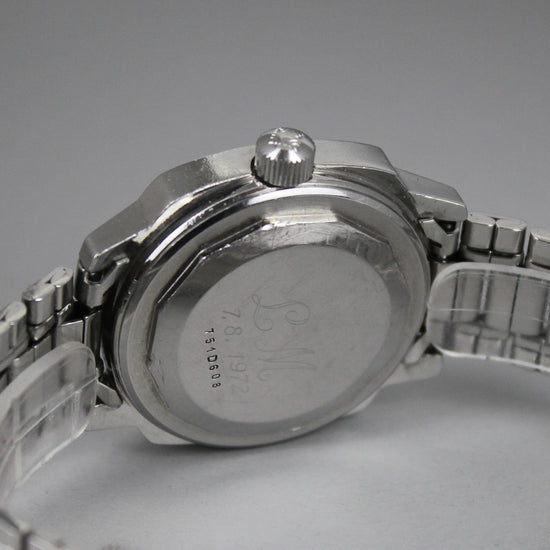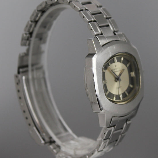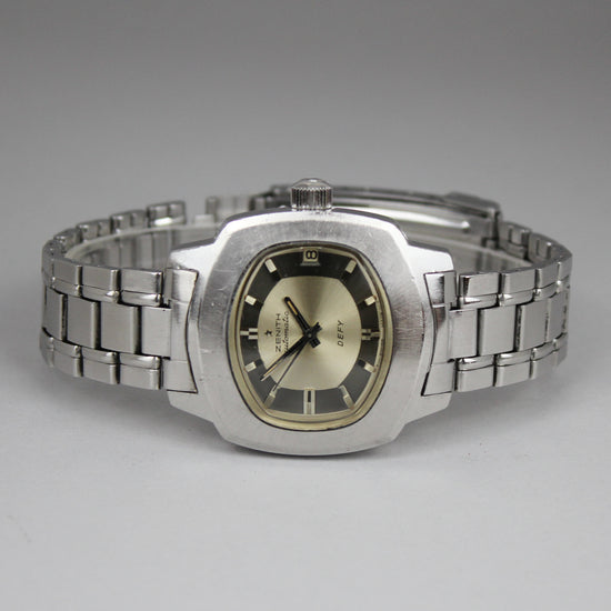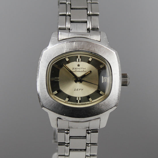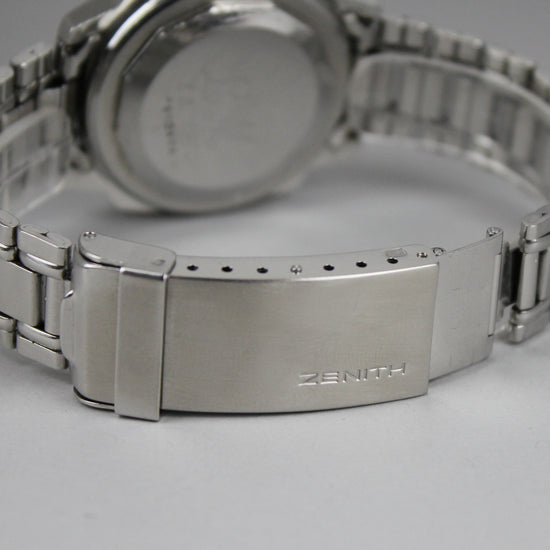 A rare Zenith Defy model that was only produced for a short time with the original Gay Freres steel bracelet. Bracelet fits a wrist of about 20 cm thick and the diving extension gives it about a couple of centimeters more length. Two-tone dial is in good condition. Case has signs of age and use and the crown is screw-down. There is a slight engraving on the caseback. Service history is unknown, but the watch works well. Date changes and the watch is running approximately +- 10 seconds per day. |
