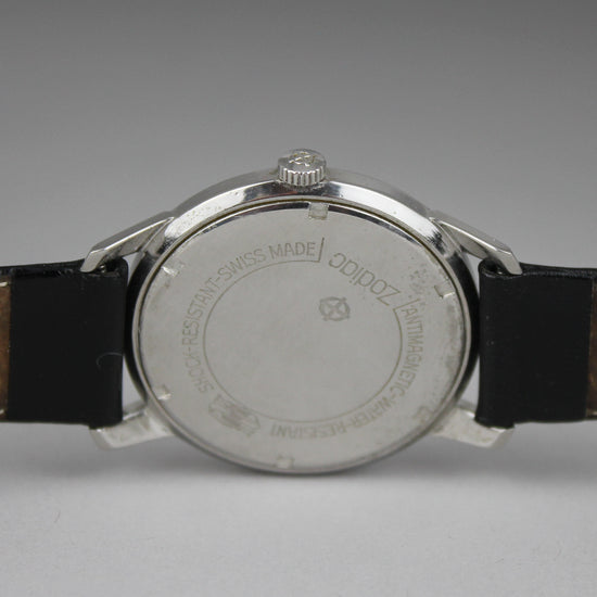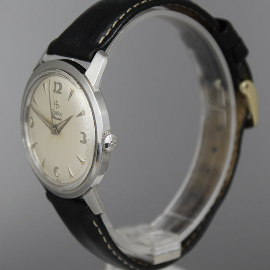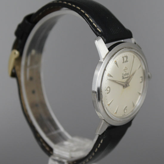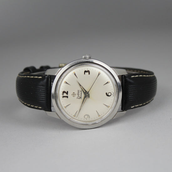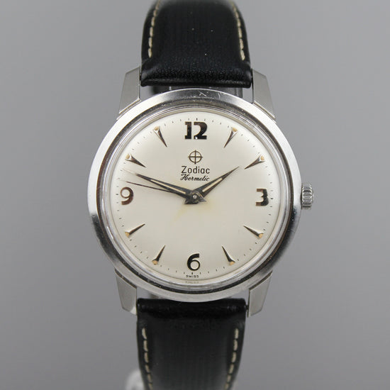 Yksinkertaisen tyylikäs Zodiacin vetokello todella ohuilla teräskuorilla. Lasike on hyvässä kunnossa, ei isoja naarmuja tai halkeamia. Taulussa on vähäistä patinaa. Kuorissa on iän sekä käytön tuomia jälkiä ja nuppi on alkuperäinen. Nahkaranneke on käytetty. Huoltohistoria ei ole tiedossa, mutta kello toimii hienosti ja heittoa sen käynnissä on noin 10 sekuntia vuorokaudessa. |