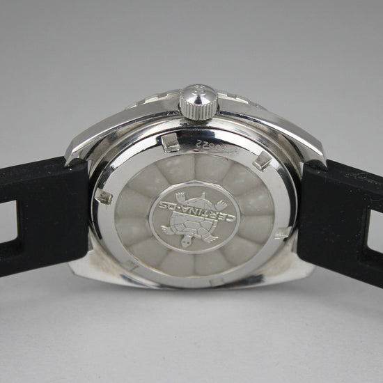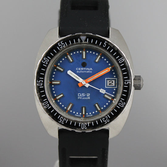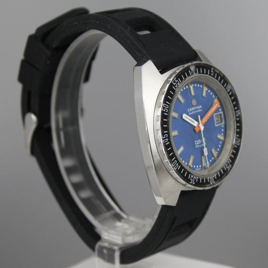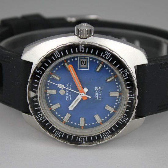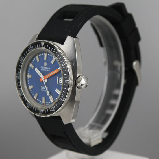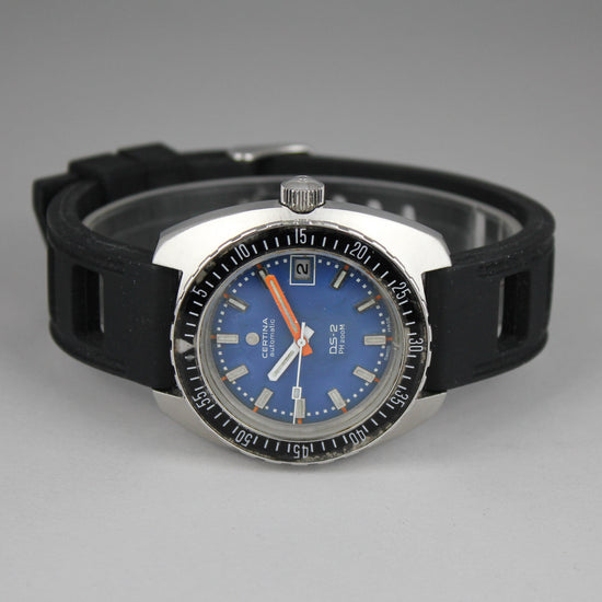 Pirteän värinen Certinan sukelluskello. Taulussa on hiukan iän tuomaa patinaa ja haalistumaa. Kuorissa on iän sekä käytön tuomia jälkiä ja alkuperäinen nuppi on ruuvilukittava. Kumiranneke on käytetty. Kello on ostettu muutama vuosi sitten Ruotsalaisesta kelloliikkeestä huollettuna ja se toimii hienosti. |