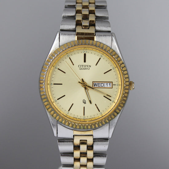 Hieno Citizenin kvartsikello, jonka design mukailee erään tutun kellobrändin suosittua mallia. Lasissa on muutama hento naarmu, jotka näkyvät valoa vasten katsottaessa. Kuorissa ja alkuperäisessä metallirannekkeessa on iän sekä käytön tuomia jälkiä ja kulumaa kultauksissa. Ranneke mahtuu noin 19 cm paksuun ranteeseen. Kello ja sen ominaisuudet toimivat hyvin. |