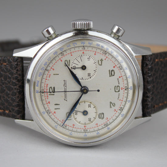 Ikäisekseen harvinaisen suurilla teräskuorilla varustettu Excelsior Parkin kronografi. Kellon on huoltanut 12/2025 kelloseppä Rene Valta. Taulussa on vähäistä patinaa, mutta sen yksityiskohdat ja värit ovat säilyneet selkeinä. Kuorissa on iän sekä käytön tuomia jälkiä. Nahkaranneke on käyttämätön. Kello ja sen ominaisuudet toimivat hienosti. |