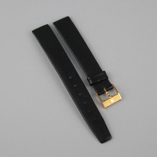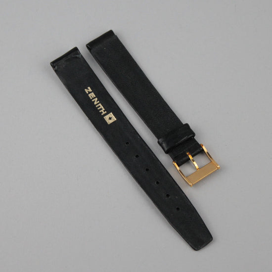 | Käyttämätön Zenithin nahkaranneke alkuperäisellä kullatulla soljella. Nahka on hieman jäykistynyt vuosien saatossa. |