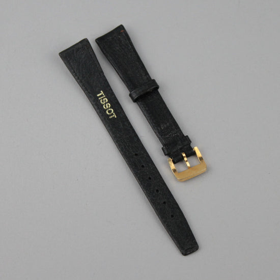 Käytetty Tissotin nahkaranneke alkuperäisellä kullatulla soljella, joka sopii kokonsa puolesta naisten kelloihin. |