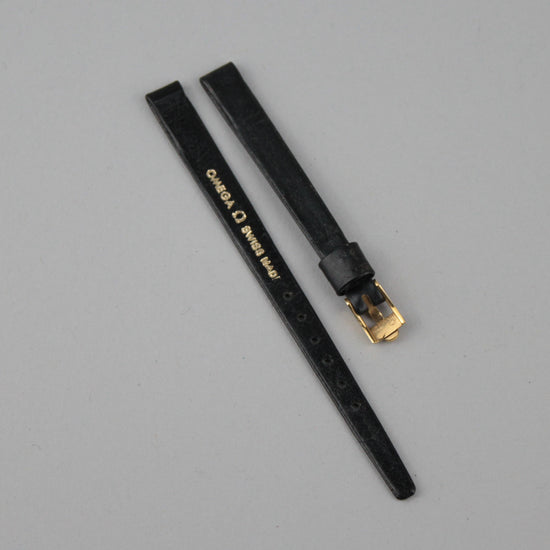Käytetty Omegan nahkaranneke alkuperäisellä kullatulla soljella, joka sopii kokonsa puolesta naisten kelloihin. |