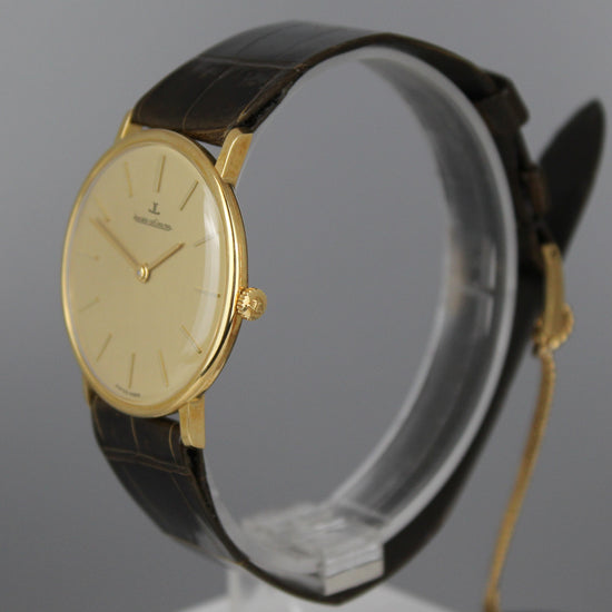 Kelloliikkeen varaston käyttämätön Jaeger LeCoultren ajattoman tyylikäs vetokello 18k kultakuorilla. Kello toimii, mutta jos se tulee käyttöön niin luonnollisestikin huollattaminen olisi suositeltavaa. Takakannessa on vielä alkuperäistä suojalakkaa tallella ja alkuperäisessä nahkarannekkeessa roikkuu hang tag. Mukaan tulee kellon alkuperäinen laatikko ja leimaamattomat paperit. |
