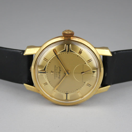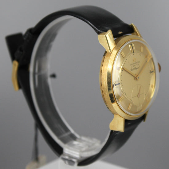 Käyttämätön Zenith Port Royal vetokello kelloliikkeen varastosta. Sisällä tikittää legendaarinen 135-koneisto, jota pidetään yhtenä historian parhaista koneistoista. Kello toimii, mutta jos se tulee käyttöön on huollattaminen luonnollisestikin suositeltavaa. Kellossa on vähäisiä vuosikymmeniä kestäneen säilytyksen tuomia jälkiä. Massiiviset 18k kultakuoret ovat hienosti viimeistellyt ja yllättävän monimutkaiset. Takakannessa on vielä alkuperäistä suojalakkaa ja hintalappu roikkuu nahkarannekkeesta. Mukaan tulee kellon alkuperäinen laatikko. |