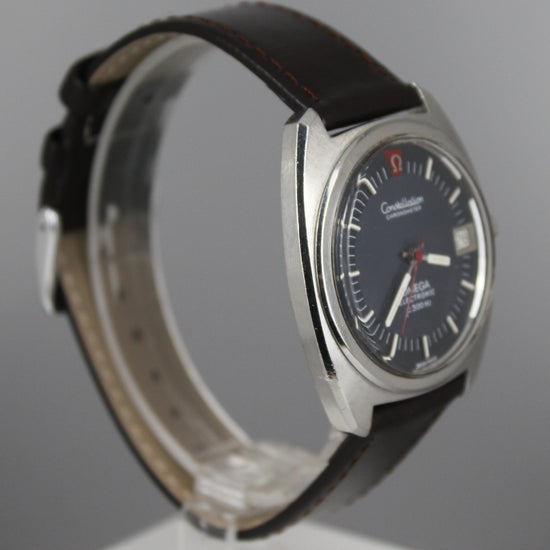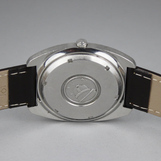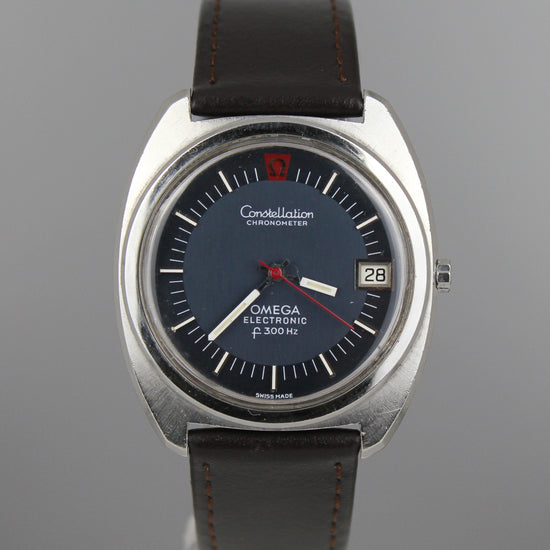 Omegan äänirautakello hienolla kaksivärisellä sinisellä taululla ja punaisilla yksityiskohdilla. Alkuperäinen lasike on hyvässä kunnossa, ei isoja naarmuja tai halkeamia. Taulussa on yksi pieni jälki kello 4 kohdalla. Kuorissa on iän sekä käytön tuomia jälkiä ja nuppi on alkuperäinen. Nahkaranneke on käytetty. Huoltohistoria ei ole tiedossa, mutta kello toimii hienosti. |