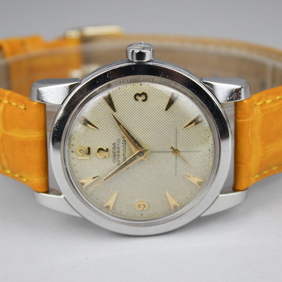 Omegan automaattikello upealla teksturoidulla taululla. Kuorissa on iän sekä käytön tuomia jälkiä ja takakannessa on kaiverrus. Nuppi on alkuperäinen ja ranneke on käyttämätön. Huoltohistoria ei ole tiedossa, mutta kello toimii hyvin ja heittoa sen käynnissä on noin 30 sekuntia vuorokaudessa. |