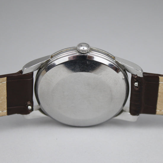 Omega Seamaster automaattikello tasaisesti patinoituneella taululla. Kuorissa on iän sekä käytön tuomia jälkiä ja nahkaranneke on käytetty. Huoltohistoria ei ole tiedossa, mutta kello toimii ja heittoa sen käynnissä on noin 30 sekuntia vuorokaudessa. |