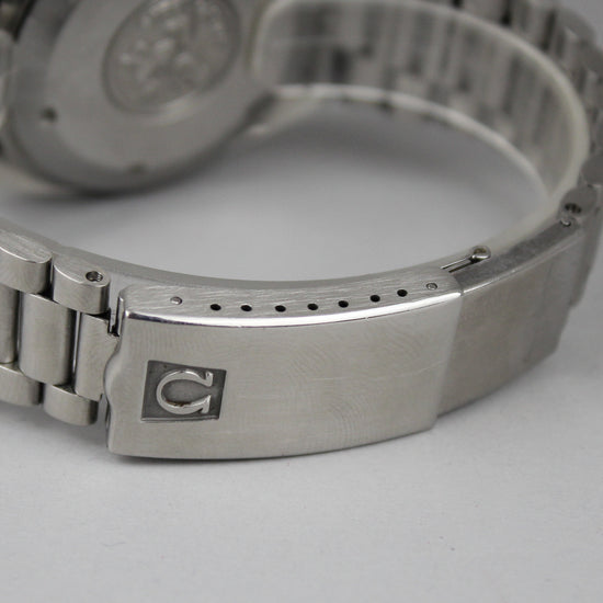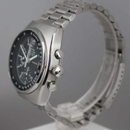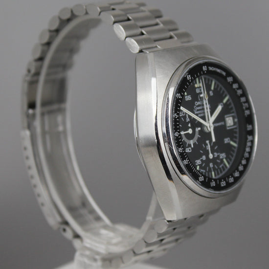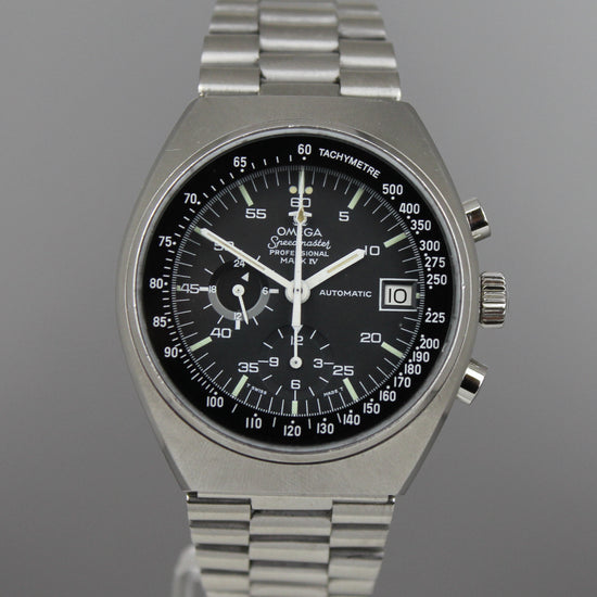 Hyvässä alkuperäiskunnossa oleva Omega Speedmaster Mark IV, joka on huollettu Longitudilla nelisen vuotta sitten. Osoittimissa on hiukan ajan tuomaa patinaa. Kuorissa on iän sekä käytön tuomia jälkiä ja takakanteen on joku joskus kevyesti kaivertanut oman henkilötunnuksensa. Nuppi on alkuperäinen. Metalliranneke mahtuu noin 19 cm paksuun ranteeseen ja jatkosolki tuo lisää pituutta noin kolmisen senttiä. Kello ja sen ominaisuudet toimivat hienosti. |