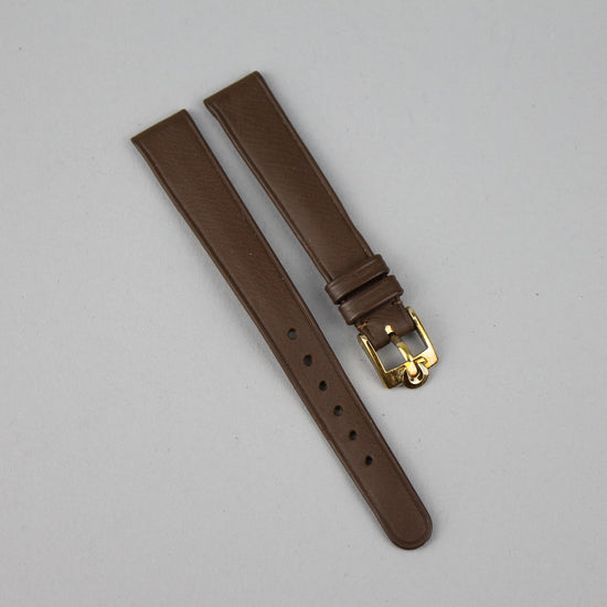 Käyttämätön Omegan nahkaranneke alkuperäisellä kullatulla soljella, joka sopii kokonsa puolesta naisten kelloihin. |