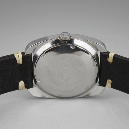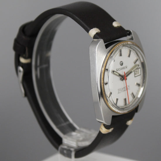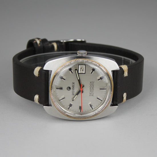 Tyylikäs Roamerin automaattikello ikäisekseen suurilla teräskuorilla. Lasike ja taulu ovat ikäisikseen siistissä kunnossa. Kuorissa on iän sekä käytön tuomia jälkiä ja nahkaranneke on käytetty. Huoltohistoria ei ole tiedossa, mutta kello toimii hyvin. Päivyrin pikasiirto toimii ja heittoa kellon käynnissä on noin 20 sekuntia vuorokaudessa. |