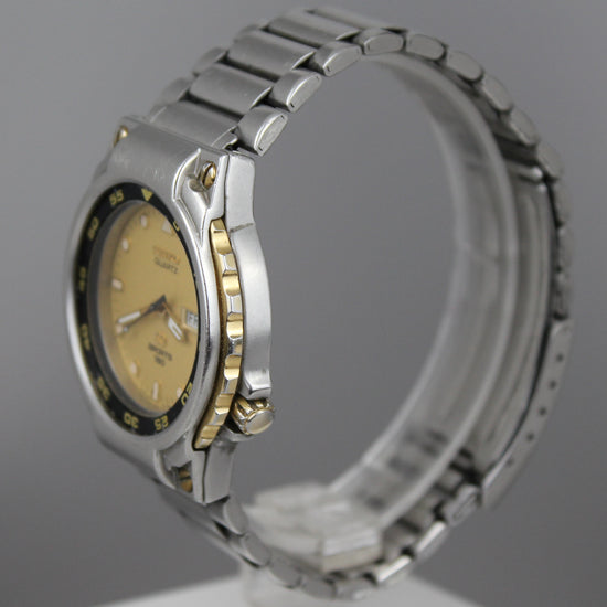 Seikon harvinainen kvartsisukelluskello. Sukelluskehässä, kuorissa ja alkuperäisessä metallirannekkeessa on iän sekä käytön tuomia jälkiä. Ranneke mahtuu noin 20 cm paksuun ranteeseen. Nuppi on ruuvilukittava. Huoltohistoria ei ole tiedossa, mutta kello ja sen ominaisuudet toimivat hienosti. |