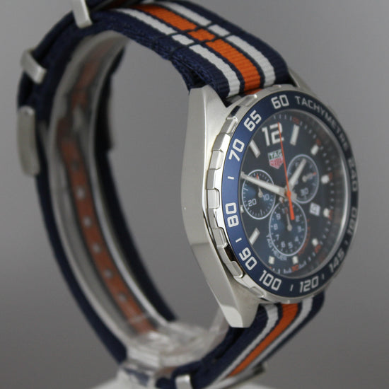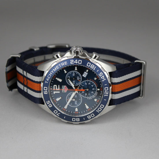 Tag Heuerin pirteä Formula 1 kvartsikello. Kellossa on vähäisiä käytön jälkiä siellä täällä. Nuppi on ruuvilukittava ja alkuperäinen natoranneke on ranteessa mukava. Kello ja sen ominaisuudet toimivat hienosti. Mukaan tulee kellon alkuperäinen laatikko ja paperit. |